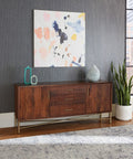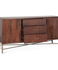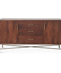 Cosmopolitan—a 68" sideboard that strikes the perfect balance between understated elegance and real-world utility. The warm honey brown finish showcases beautiful natural wood grain, while fluted front panels add visual interest without trying too hard. Antique brass gold accents on the legs and hardware bring a touch of refined glamour to the mix. Whether you're outfitting a dining room, living space, or retail display, this piece delivers generous storage, solid construction, and that artisanal quality that makes a room feel intentional and put-together.