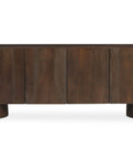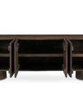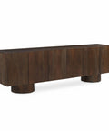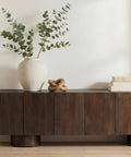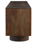 The Hadley media unit proves that less is more. Constructed from reclaimed neem wood in warm brown, this entertainment piece embraces natural character and sustainable craftsmanship. A solid 2-inch tabletop rests on sculptural cylindrical bases, creating visual interest through pure geometry. Behind six minimalist doors lies thoughtfully organized storage for all your media essentials and entertainment gear. Built-in cable management keeps everything connected without the visual clutter. Perfect for anchoring a living room or bedroom, the Hadley's refined proportions and honest materials deliver quiet sophistication that complements any modern interior.