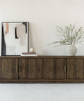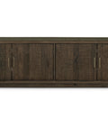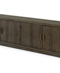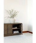 The Monterey media cabinet brings together rustic warmth and contemporary restraint. Crafted from pinewood with a rich, aged brown finish that echoes natural driftwood, this entertainment piece anchors any room with understated sophistication. A sturdy blocked base supports four magnetic-catch doors that open to reveal generous storage compartments and adjustable shelving—perfect for organizing media equipment, gaming consoles, and entertainment gear. Integrated cable management cutouts keep your setup clean and clutter-free. Whether positioned as a subtle accent or commanding focal point, the Monterey's matte, darkly inviting finish and gently curved silhouette deliver rustic character without the visual heaviness.