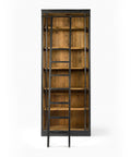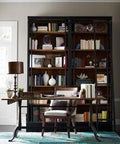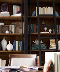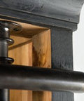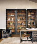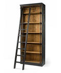 A two-tone finish beguiles the senses in this antiqued, library bookcase. The exterior is finished in hand-rubbed black while interior shelves with unique iron supports reveal the natural beauty of reclaimed pine. For use with or without available library ladder, for decorative use only.